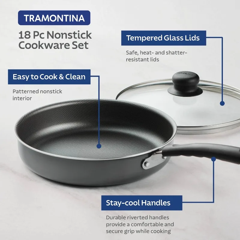 Tramontina's prima ware 18-piece nonstick cookware set provides all the cookware essentials and is an excellent starter set. The patterned interior nonstick coating ensures easy cooking and simple cleanup. Available in two colors, the dishwasher safe cookware set makes prepping meals for one to many a breeze. Coordinating utensils and pots make this collection both practical and functional. This aluminum cookware set is lightweight and can be used by any level meal preparation person. Stay-cool handles decrease the chance of burning yourself when you are preparing and see-through lids lets you keep close watch on progress. The Tramontina's prima ware 18-piece nonstick cookware set works well with most range types.