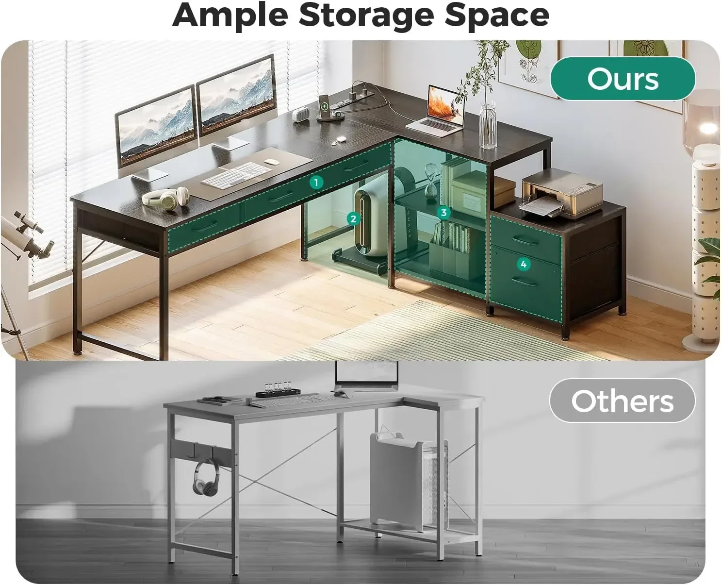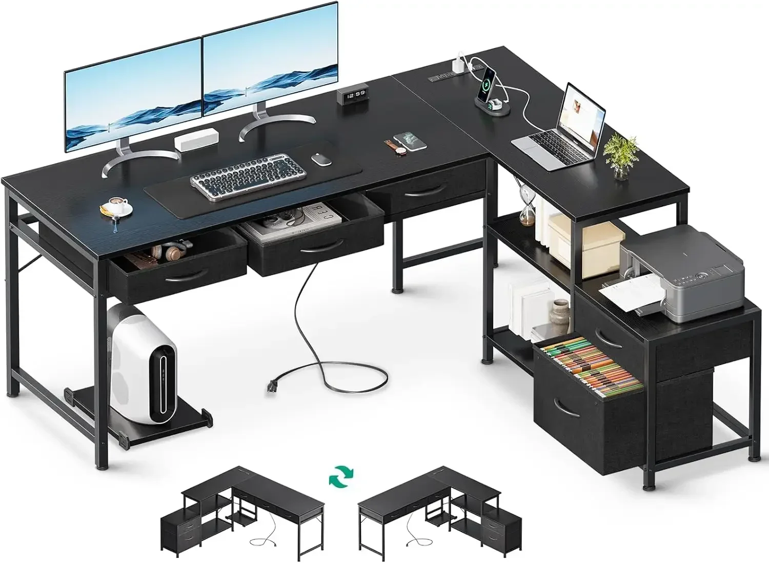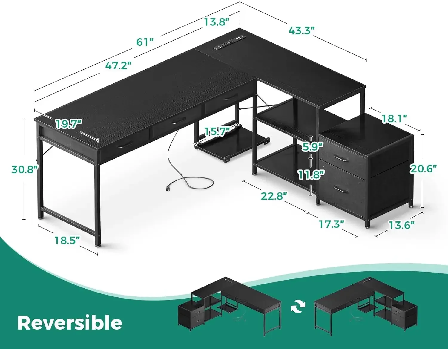 L Shaped Computer Desk with Fabric Drawers and File Cabinet, 61" Reversible Home Office Workstation Desk with Power Outlets & Host Stand, Corner Gaming Table with Storage Shelves, Black