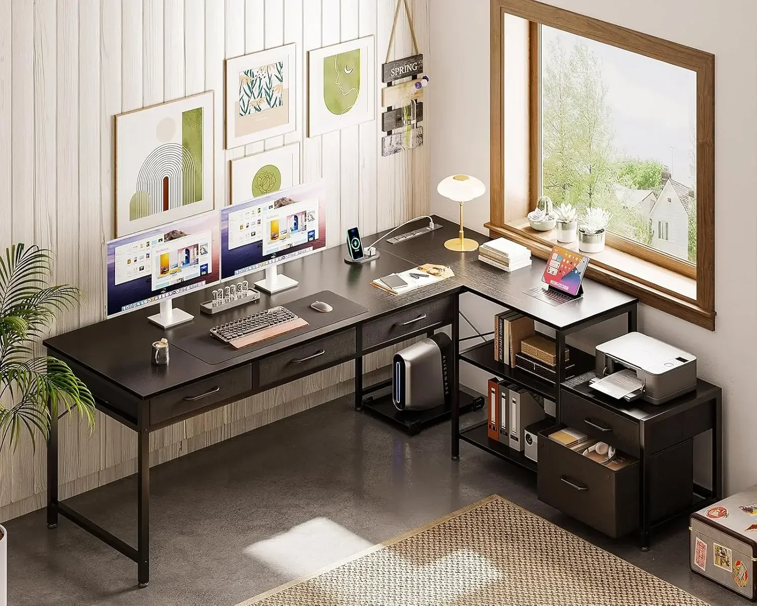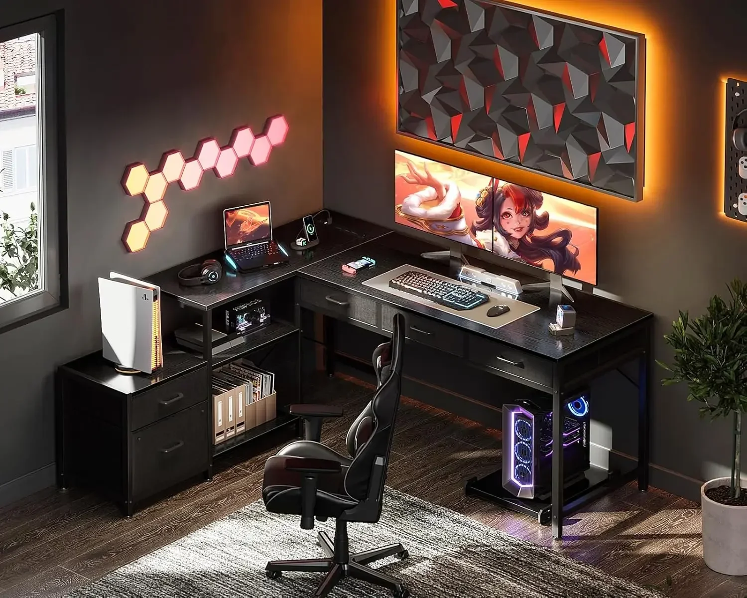 - 【Reversible L Desk with Two-tier Shelves】: This gaming desk has two storage shelves helping you accommodate more books and documents needed for office and study while strengthening the desk's weight-bearing capacity. The left and right interchangeable design allows this l-shaped desk to be placed in any corner of your room or office area, providing you with great convenience.